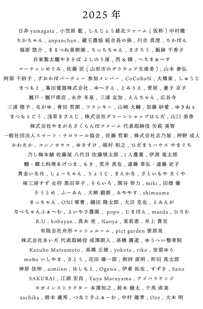 デジタル刻印2025 2025-12-31 2026-02-01 お知らせ ざおかぼは、皆様からいただいたご支援のお気持ちを重ね、蔵王かぼちゃの需要と供給のバランスを整えながら活動しております。2025年、皆様からいただきましたご支援の証としてここに刻印いたします。※順不同、敬称なしの掲載をご容赦ください